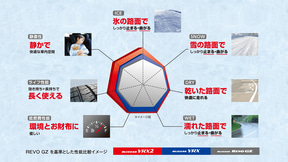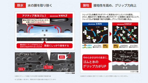 ブリザック VRX2に採用している独自技術の「アクティブ発泡ゴム2」は、ゴムの中の気泡がスポンジのような働きをして氷雪上の水の膜を取り除き、従来品より多く配合した摩擦力向上剤で路面を捉えるゴムの粘りを強くしています。さらに、剛性を高めた非対称のトレッドパタンを採用することで、氷上でもしっかり止まる・曲がるを実現。例えばブレーキ性能は、既存モデル(ブリザック VRX)より制動距離を10%短縮しています。