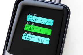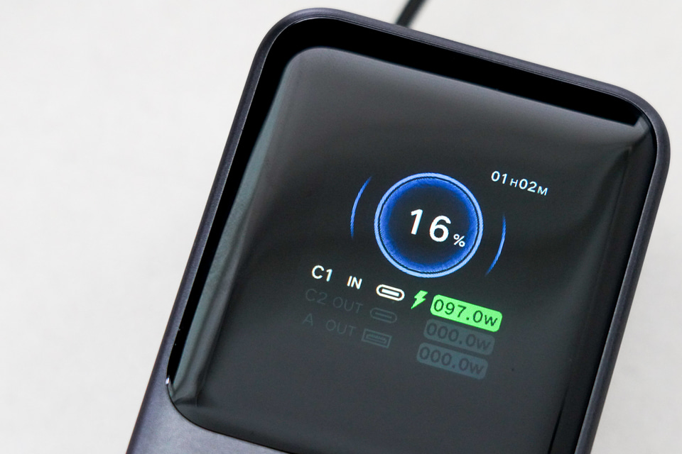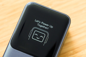 大きな液晶表示が付いていて、残量パーセンテージはもちろん、ポートそれぞれの使用状況が詳細に分かるのもありがたい。画面表示中は各ポートの使用(充電時は充電)ワット数が表示されていて、さらにボタンを押すと時間経過がグラフ表示され、電圧とアンペアも分かるようになっているなど、ガジェットマニアも納得の多彩な情報表示だ。起動時やスリープ前、バッテリー低下といったときに、キャラクターのアニメーション表示もあったりして楽しめる。