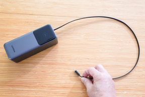 この巻き取り式ケーブルでモバイルバッテリー自体の充電を行なえるので、USB Type-C出力のACアダプターがあれば、別途ケーブルを用意することなく充電できる。