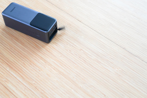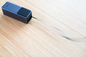 バッテリーはリチウムイオン。5000mAhの高性能セル4本を直列接続していて、1000回充電後にも約70%容量を維持するという。重量は約540g。だいたい500mLのペットボトル程度だ。容量を考慮すれば、比較的コンパクトに収まっている。一般的にモバイルバッテリーは平たい形状が多いが、羊羹みたいな立方体形状になっている。この形は机に置いて、ノートPCなどの横に置くと使いやすく感じる。