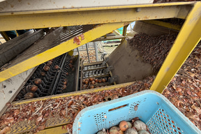農業チームがお世話になったのは、ホタテと並ぶ常呂町の名産物・玉ねぎの生産農家さんだ。収穫した玉ねぎがベルトコンベアで次から次へと流れてくる巨大な機械の台に立ち、長い茎葉を切ったり、形のわるいものを避けたりする作業をした。