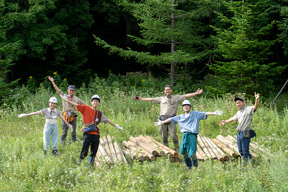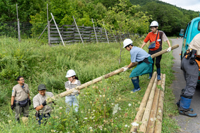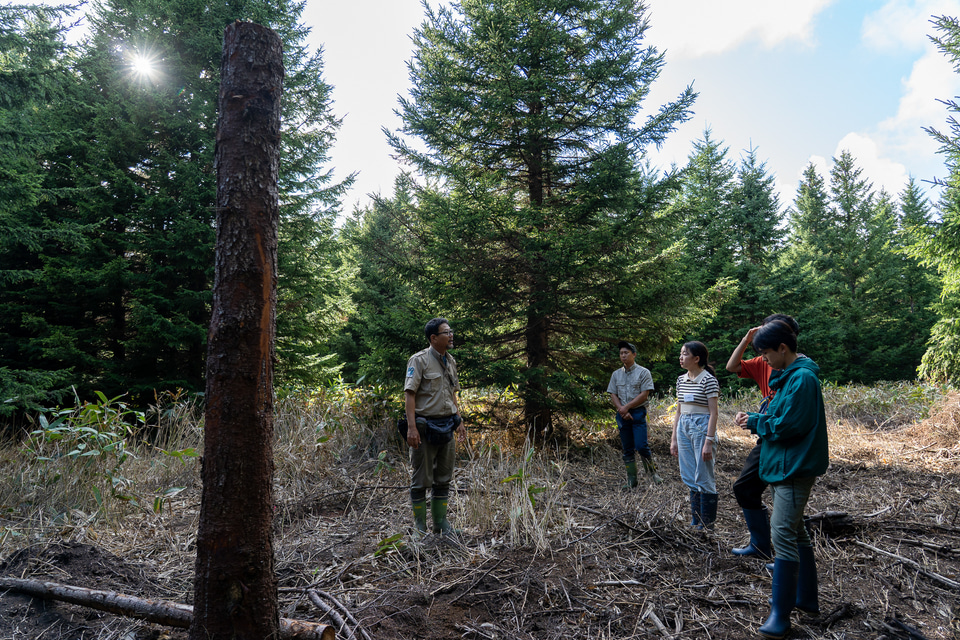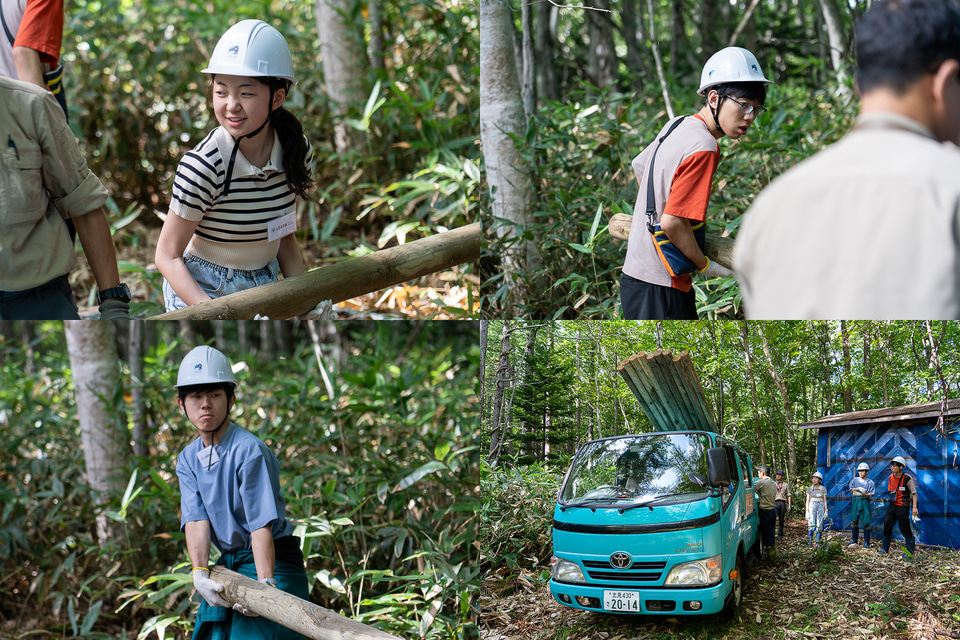 私が帯同したのは「森林再生」班。かつて乱開発の危機にあった地を保全し原生の森に復元する「しれとこ100平方メートル運動」について学んだあとは、森で使う資材を運んだり、森作りの最新手法を実践する場所を見学したりした。
