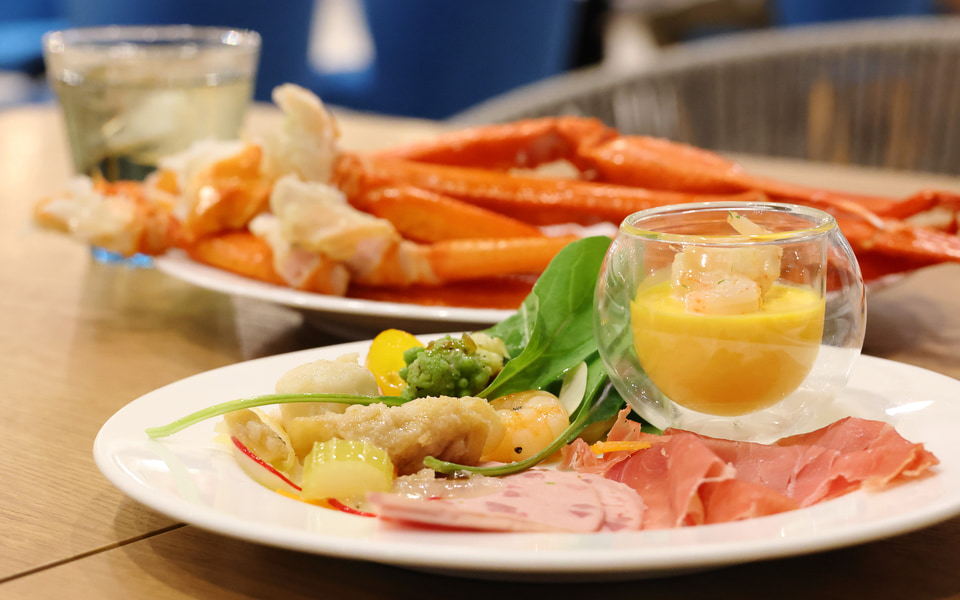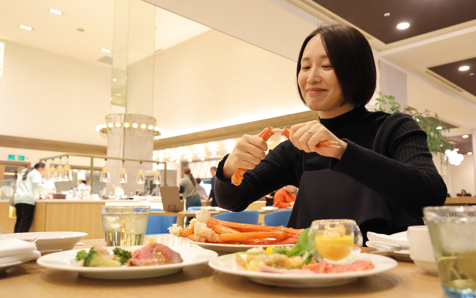 ディナーは、ビュッフェスタイルのオールデイダイニング「オールフラッグ」へ。開業30周年を記念して2026年1月30日まで「蟹食べ放題 フェア」を開催しているという。せっかくなのでたくさんの美味しいカニを頬張り、ほかにもお肉や季節の野菜を使ったビュッフェをたっぷり堪能。そのあまりの美味しさに「思い切って神戸に来てよかった!」と心から実感した。