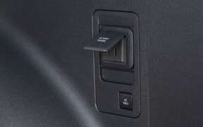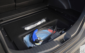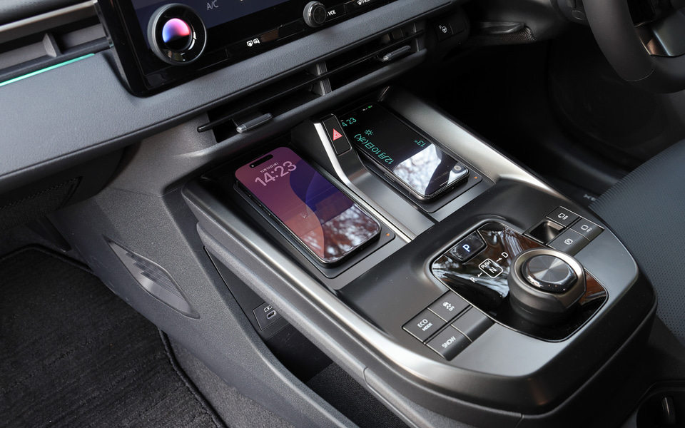 シートはしっとりとしていて掛け心地がよく、運転席まわりはコンパクトな液晶メーターと立体的なステアリングの作りが航空機のコクピットを思わせる。シフトノブは丸型で、押し込んで回すことで切り替えるタイプだ。めずらしいなと思ったのは、センターコンソールにスマホのおくだけ充電を2台分装備していること。おくだけ充電ができるクルマは増えているものの、2台並べて用意したクルマはめずらしい。室内はシンプルな印象だったが、使い勝手は先進的で洗練されているなと感じた。