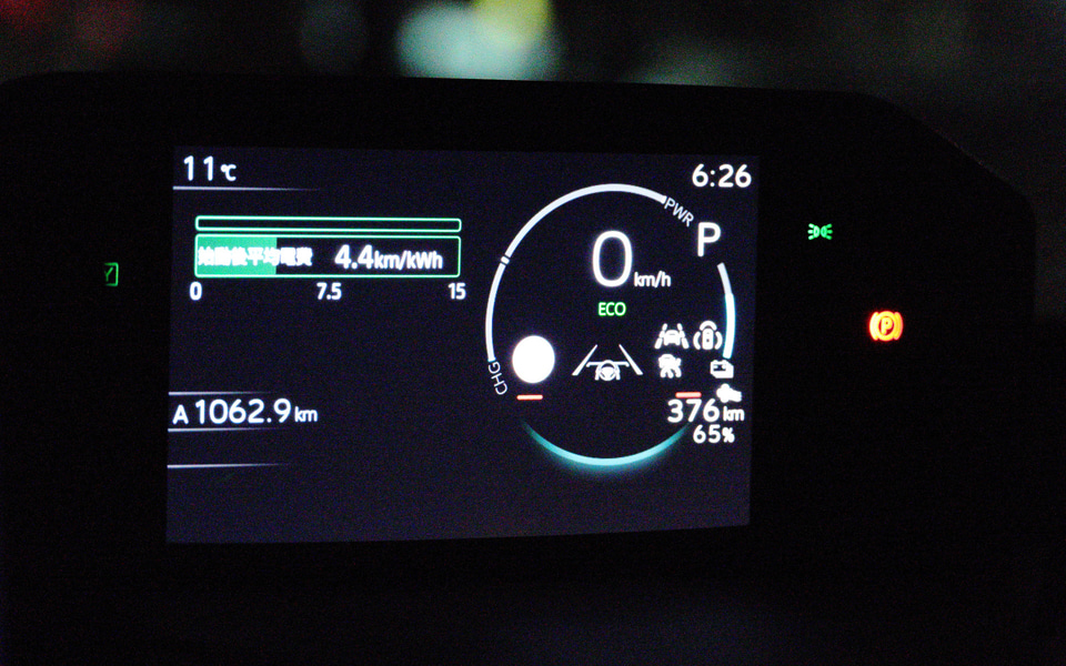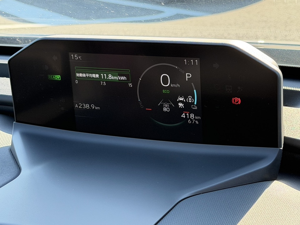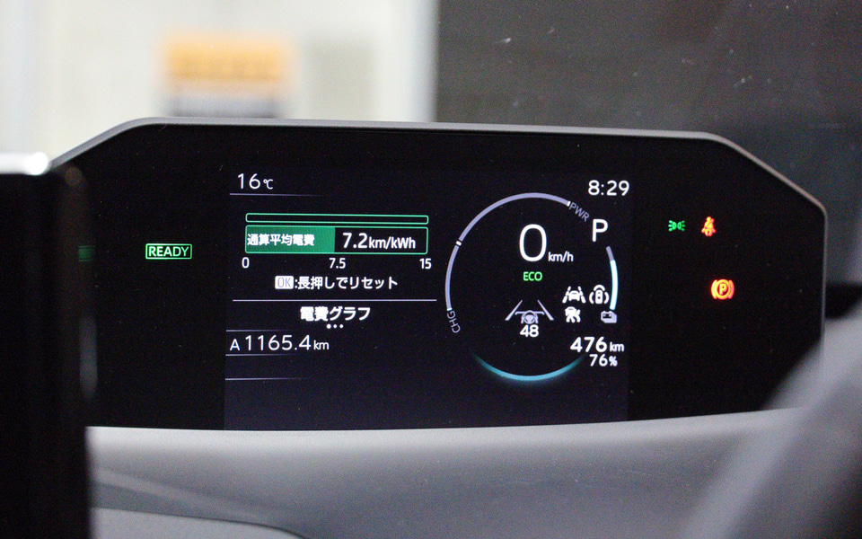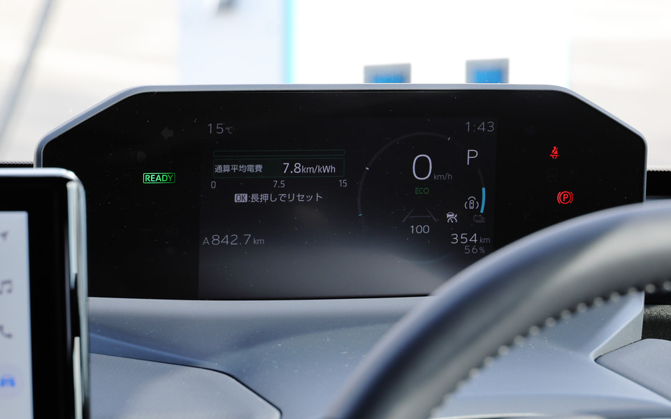 ただし、この通算平均電費だが、東名高速 浜松SAで撮影のために一度リセットしており、そこまでの表示は11.8km/kWh。走行距離と電費表示から計算すると電費10.3km/kWhとなり、10km/kWhを超える状況で走っていたようだ。