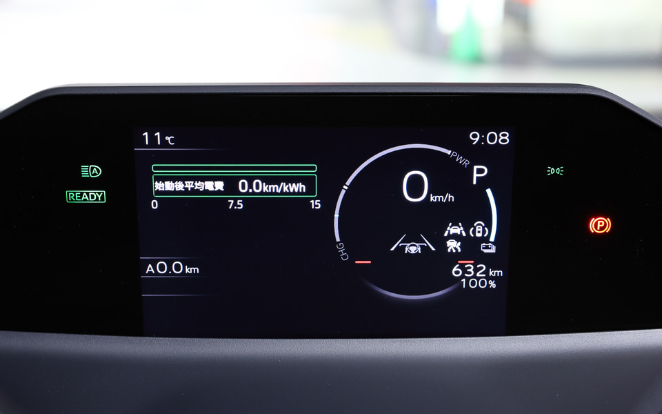 出発前、普通充電器で満充電にした状態から電源ボタンを押してみると、メーター内には航続距離632kmと表示されていた。これまでの電費によって低めに反映されているのかもしれないが、これでも神戸までは十分たどり着けそうだ。