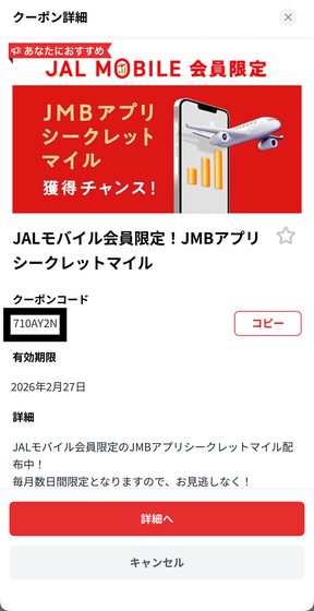 シークレットマイルのバナーは、JMBアプリ内の「JAL Pay」券面下の「マイレージ」タブを押下した「クーポン」にひと月に数日間限定で表示されます。表示されたクーポンコードをコピーして、JMBアプリの右下にあるアカウント→設定→プロモーションコード入力と進めばOK! 入力から1か月以内に100マイルが積算されます。