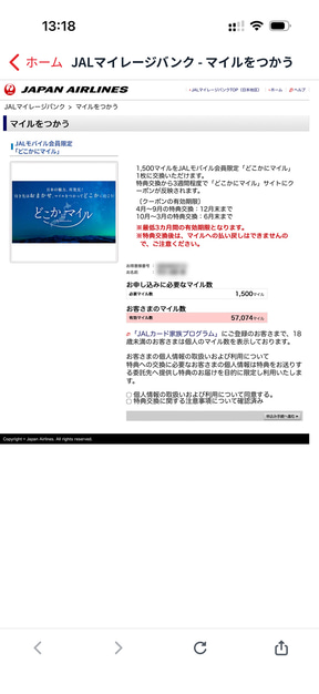 このバナーは、JALモバイル利用開始後3か月以内に、JMBアプリの「JAL Pay」券面下の「マイレージ」タブの「おすすめ情報」のなかに表示されるので、遷移先の画面で1500マイルを特典に交換するという流れとなります。特典交換から3週間程度でどこかにマイルサイトにクーポンが反映されて、「どこかにマイル」が利用可能になります。