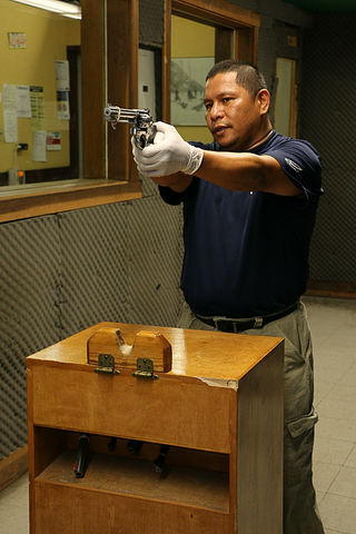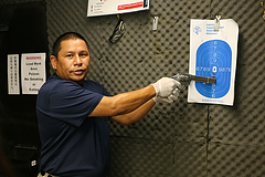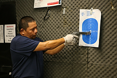 なにより安全第一、事故なくアクティビティとしての射撃を楽しむためにも、指導は真剣そのもの。回転式拳銃、オートマチック拳銃、それぞれの持ち方、構え方、姿勢、照準の覗き方なども詳しく説明を受けます。