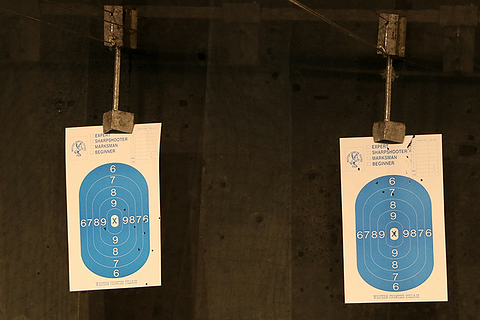 試し撃ちを行ない、姿勢や照準の狙い方について再度アドバイスを受けます。最初、Y先輩は的の右下に、新人Mは的の上側に着弾しましたが、指導を受けて徐々に真ん中を狙えるように。