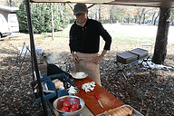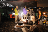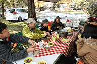テーブル類をセットして、ガスやホワイトガソリン式のバーナーでお湯を沸かし、その間に炭をおこして、薪を焚いて、ふとテーブルを見れば既に野菜類のカット作業が始まっていて、いやはや流石はプロ。動きに無駄がありません。「これが正解」というやりかたはないそうですが、自分がやりやすいスタイルを見つけるべく、キャンプ部の皆さんも真剣にメモを取ったり質問したり。