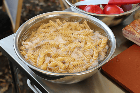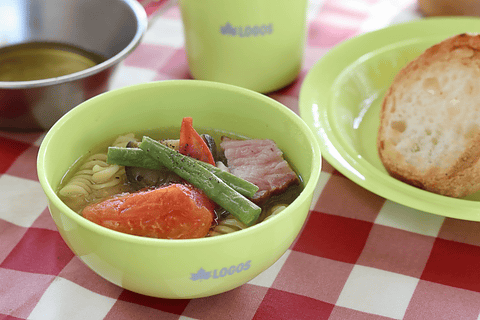 初日の昼食はスープパスタに決定。ステンレスボウルに乾燥したパスタをいっぱいに入れ、沸かしてあるお湯ではなくて水をドバドバと投入。