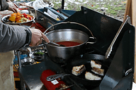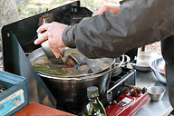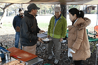 これまで道具も調理法も各自の経験を持ち寄って自己流でやってきたというキャンプ部のみなさん。アッと言う間に設営された小雀さんのアウトドアキッチンを見て、まず気がついたのはテーブル類の高さと配置。調理テーブルはちょっと高めに、バーナーテーブルはちょっと低めに、水タンクやゴミ入れの配置など作業動線を考えた効率的なセッティングに一同感心しきりでした。