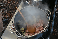 Q:「今日はまさかの雪景色で綺麗ではありますが、やっぱり寒いし料理も冷めやすいですよね(笑)。手軽で温かい冬のキャンプメニューのオススメはありますか?」