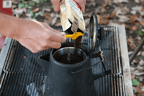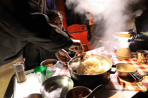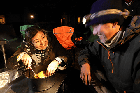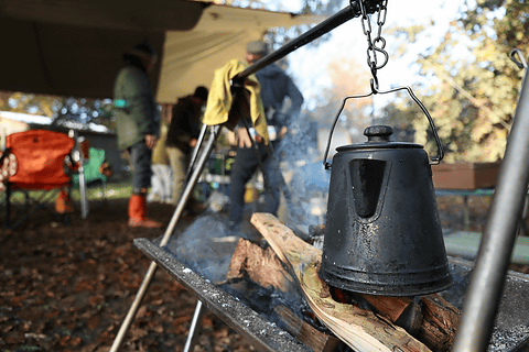 「道具をひととおりセットしたら、夏でも冬でもまずは必需品のお湯を沸かすのがオススメです。料理に使うのはもちろん、コーヒーも飲めるし何かと便利ですよ。」と小雀さん。