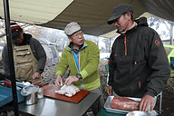 灼熱のダッチオーブンをリフトで上げ下げするのはちょっとコツが必要なので小雀さんにやってもらいつつ、ローストチキンは廣瀬さんが、ローストビーフは太田さんが火元責任者を担当。