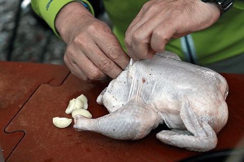 丸鶏は中を洗い、水気を取ったら塩をすり込み、ニンニクをたっぷり詰めます。ハーブなどを使ってもよいですが、今回は小雀さんおすすめの「小笠原の塩」を使い、素材を活かしたシンプルな味付けに。