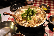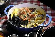 ご飯はスープパスタの残りスープを活用してパエリア風に炊き込みました。ミョウガと三つ葉をチラシ、爽やかに仕上げます。つづいてブイヤベース鍋の蓋を開けると~……ハマグリ、ムール貝、鱈、エビ、各種野菜の旨みが濃縮された、まさに海の宝石箱。