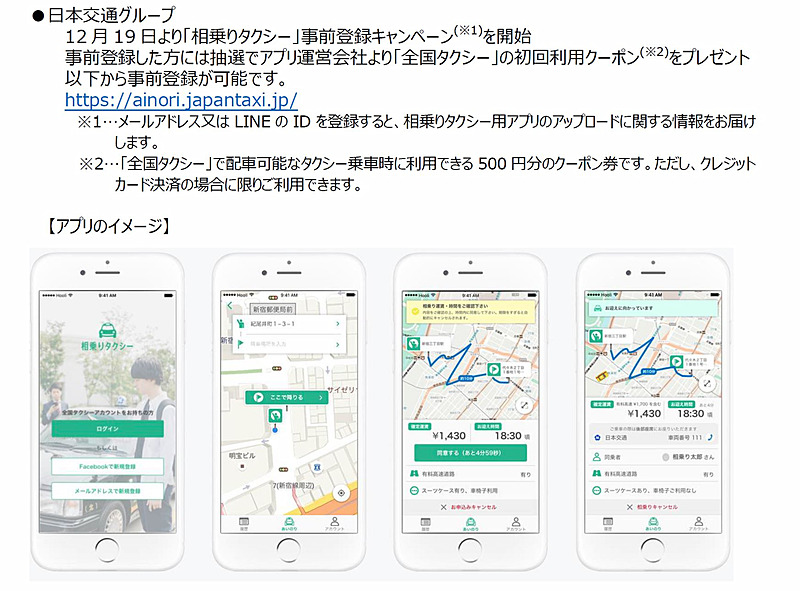 相乗りタクシーの実証実験、東京で1月22日9時スタート。終電後の帰宅や空港へのアクセスを割安に