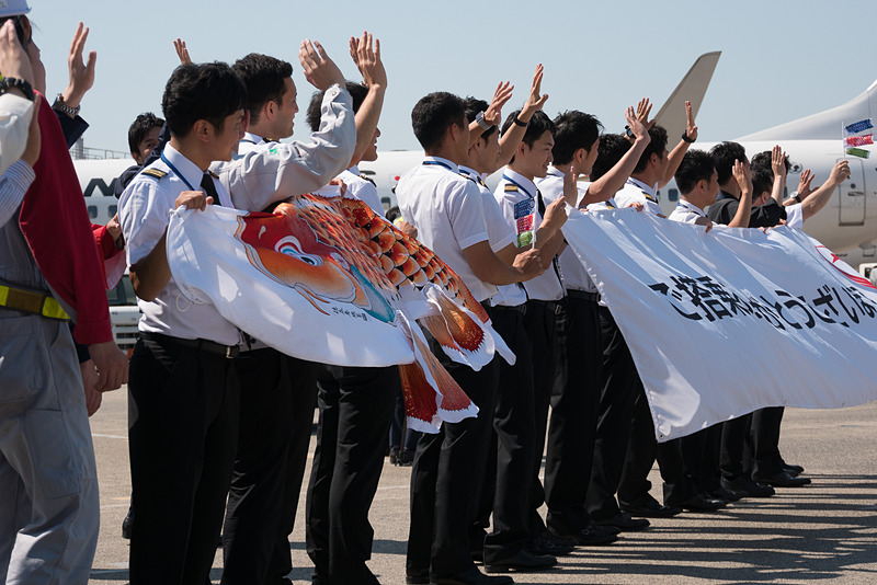 JAL、こどもの日恒例の男性スタッフだけで運航する「こいのぼりフライト」。第9回目を羽田~旭川便で実施