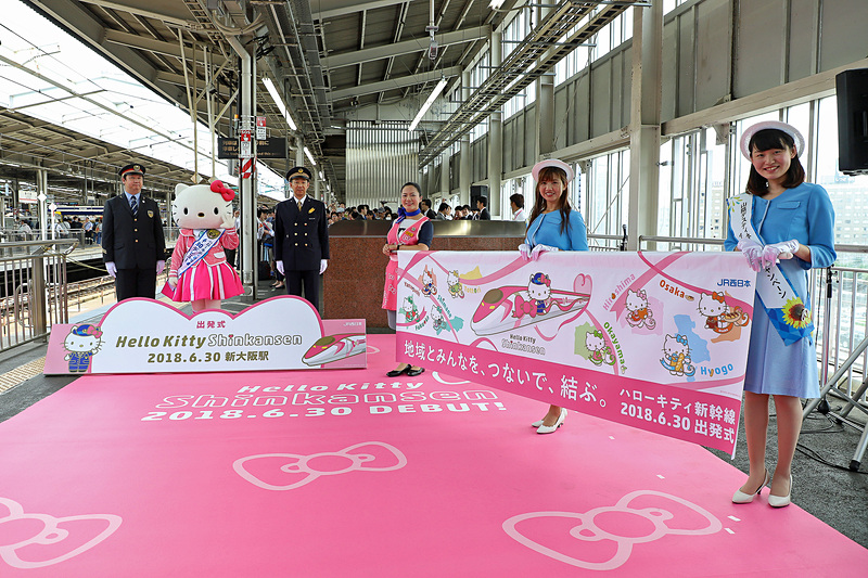 ハローキティも祝福! JR西日本、ピンク色の500系新幹線「ハローキティ新幹線」運行開始