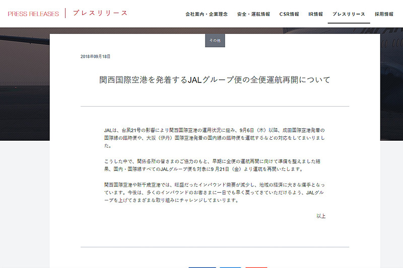 JAL、関空第1ターミナル発着での運航を9月14日再開