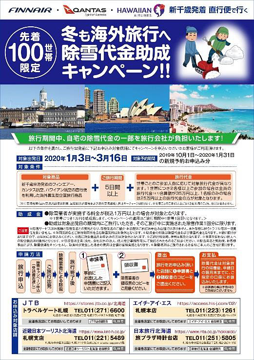 北海道の旅行会社4社、海外旅行中の除雪代金を一部負担するキャンペーン