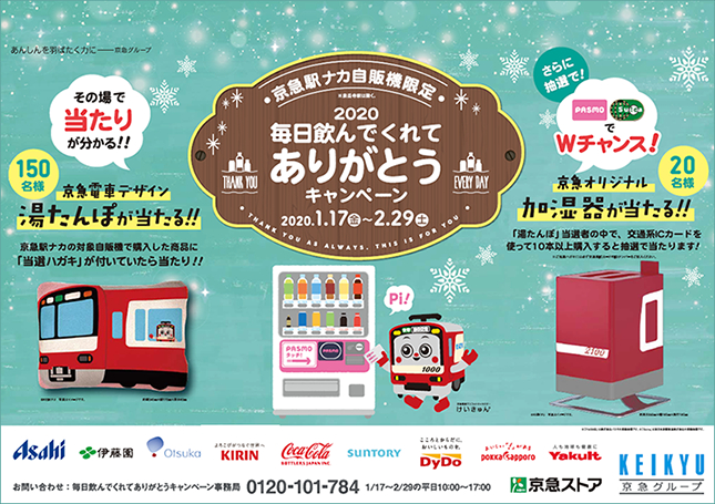 京急の駅ナカ自販機利用で京急電車デザインの湯たんぽが当たるキャンペーン