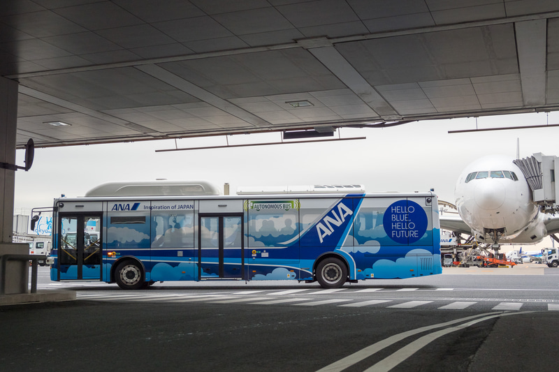 • ANA、大型電気自動運転バスによるスタッフ移動を羽田空港で実証実験。2021年内に旅客輸送の試験運用へ