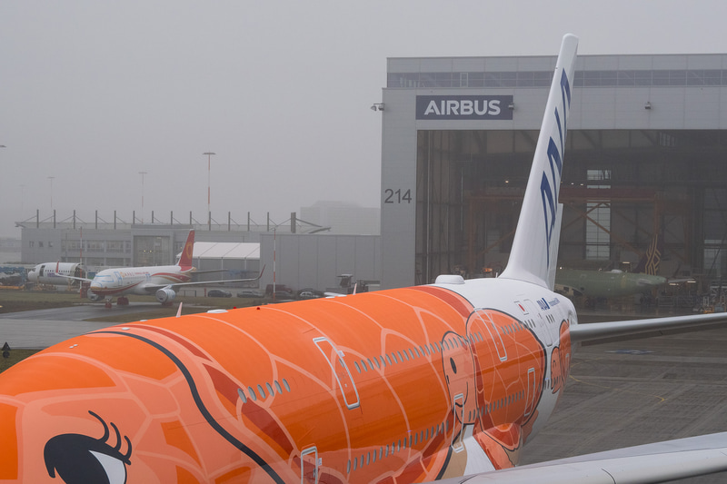 • “空飛ぶウミガメ”誕生。エアバス、ANAのA380型機「FLYING HONU」初号機の塗装を終え、独ハンブルクでロールアウト