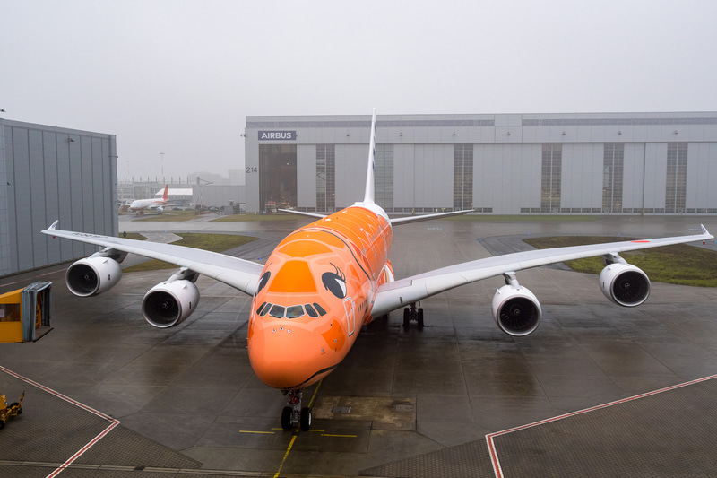 エアバスとANA、オレンジのA380型機をお披露目。3号機がハンブルク工場でロールアウト