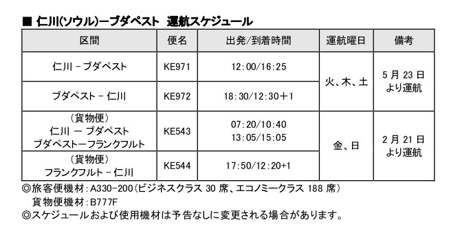 大韓航空、ソウル~ハンガリー・ブダペスト線を5月23日就航