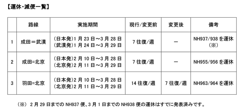 ANA、新型コロナウイルス拡大で中国路線の運休/減便を拡大。機材小型化も