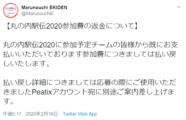 2月29日開催の「丸の内駅伝2020」も中止に、参加費は返金