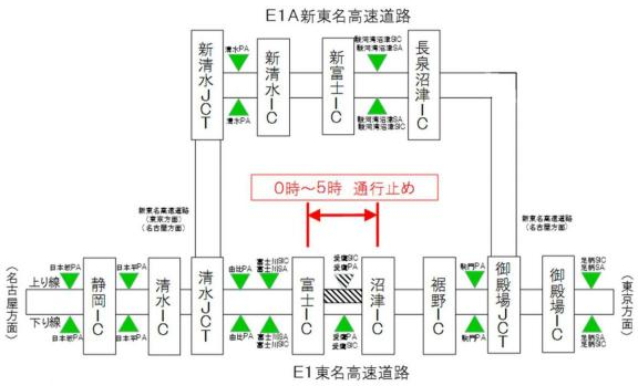 NEXCO中日本、東名・上りの富士IC~沼津IC間で緊急の夜間通行止め