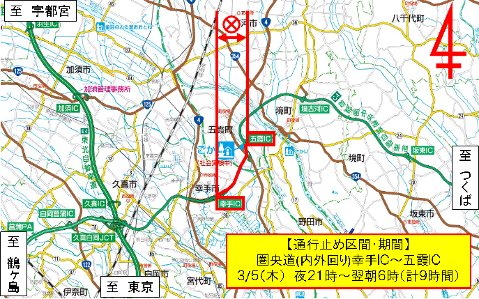 NEXCO東日本、圏央道(内外回り)の幸手IC~五霞IC間で緊急の夜間通行止め