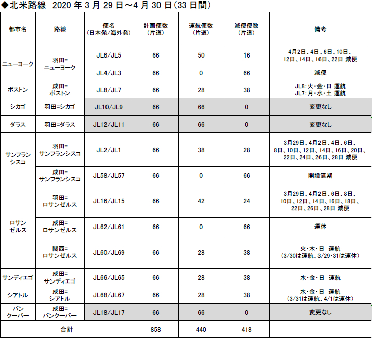 • JAL、3月29日~4月30日の国際線での運休・減便を発表