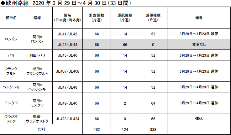 • JAL、3月29日~4月30日の国際線での運休・減便を発表