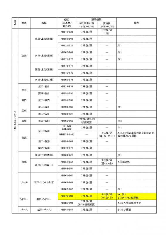 • ANA、国際線の運休/減便追加。片道のみの旅客便増加。無影響路線は成田~シカゴ線のみに