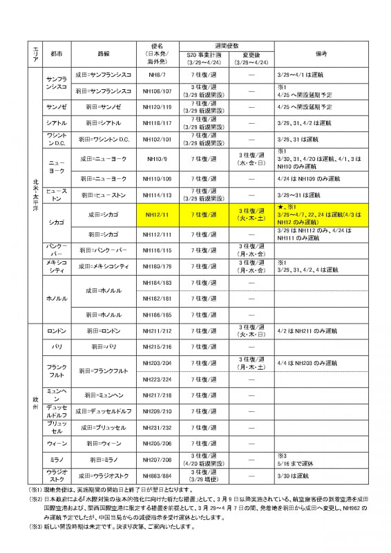 ANA、国際線の運休/減便追加。片道のみの旅客便増加。無影響路線は成田~シカゴ線のみに