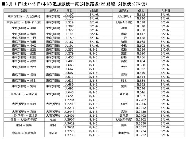 JAL、8月1日~31日の国内線で減便を発表。計画比90%超まで回復