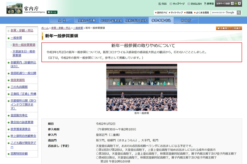 宮内庁、2021年の「新年一般参賀」を中止に