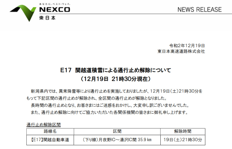 大雪による関越道の通行止め解除は19日朝の見込み