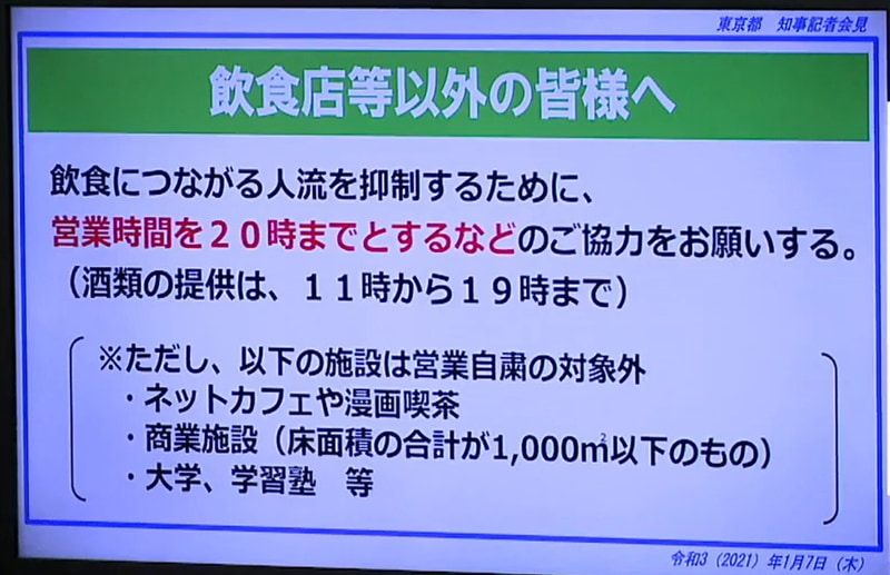 • 1都3県の緊急事態宣言発出。飲食店は20時までの時短要請。菅総理「今一度制約のある生活をお願いする」