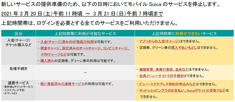 モバイルSuica、3月20日11時~21日7時に大規模なシステムメンテナンス