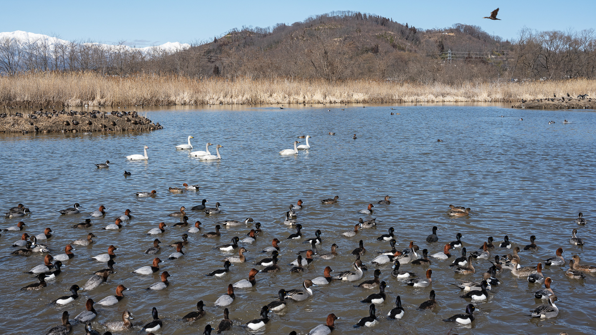 長嶺大池、ハクチョウの飛来数が過去最高の700羽を突破