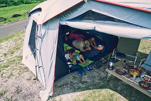 女性1人でもワンタッチで設営できる「ビッグベアーテント」。4~6人の家族キャンプなどに