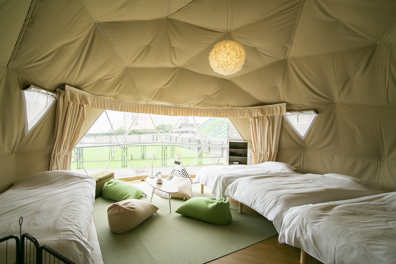 石川県七尾市にグランピング施設「glampark 能登小牧台」。国民宿舎の温泉・展望露天風呂を利用可能