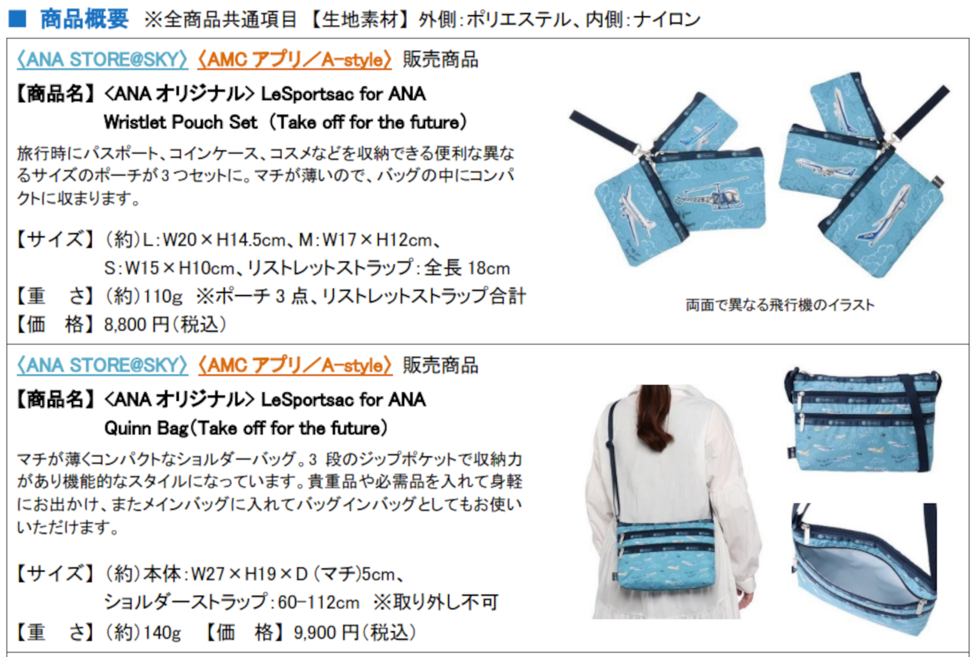 ANA×ファミリア、コラボ第2弾。子供用レッスンバッグ/Tシャツ/巾着セット/文具セット