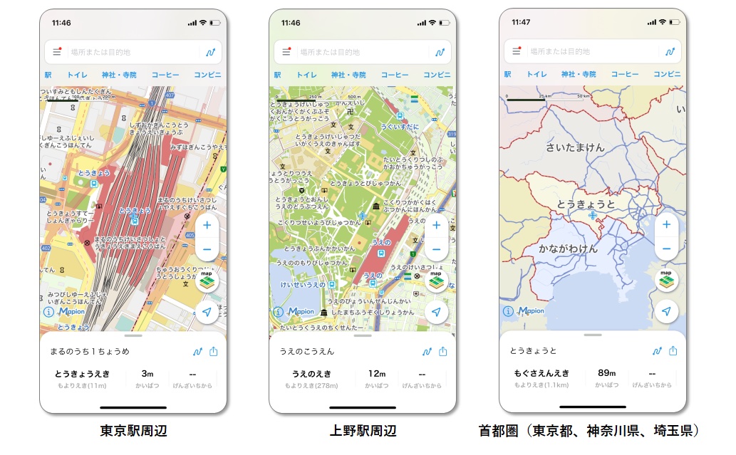 アプリ「地図マピオン」に到達圏マップ/通り名マップ追加。移動手段ごとの到達圏や道路・交差点・橋の名称を表示